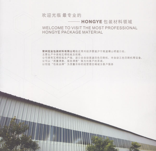 常州宏業(yè)包裝材料有限公司從最初的鮮為人知發(fā)展到現(xiàn)今包裝材料行業(yè)的主流品牌之一。公司生產(chǎn)的包裝材料產(chǎn)品不僅在國內(nèi)已經(jīng)建立了大量的穩(wěn)定的客戶,產(chǎn)品也已遠(yuǎn)銷到國外多個(gè)國家和地區(qū),深受客戶的好評。 公司臨近常州經(jīng)濟(jì)要道滬寧高速橫山道口處,主要生產(chǎn)中高檔瓦楞紙板及紙箱,公司擁有瓦楞紙板生產(chǎn)線、進(jìn)口全自動(dòng)高速四色印刷機(jī)、半自動(dòng)三色印刷機(jī)等設(shè)備,公司以“質(zhì)量滿意,服務(wù)滿意”做為向客戶的承諾,以創(chuàng)造“包裝品牌”為質(zhì)量目標(biāo)的經(jīng)營理念竭誠為客戶服務(wù)。 公司已通過ISO9001和1400的認(rèn)證。 宏業(yè)包裝的商業(yè)信條:宏業(yè)相信自己會(huì)成功, 宏業(yè)相信自己所銷售的商品 ,宏業(yè)員工相信自己所在的公司 ,宏業(yè)相信自己的員工和客戶,宏業(yè)相信成功并不是賺取金錢,而是創(chuàng)造信譽(yù),只有好的信譽(yù),成功才會(huì)有價(jià)值,宏業(yè)相信世界上最美好最偉大的詞就是“自信”,宏業(yè)相信自已每做一次銷售,就交上一個(gè)朋友。