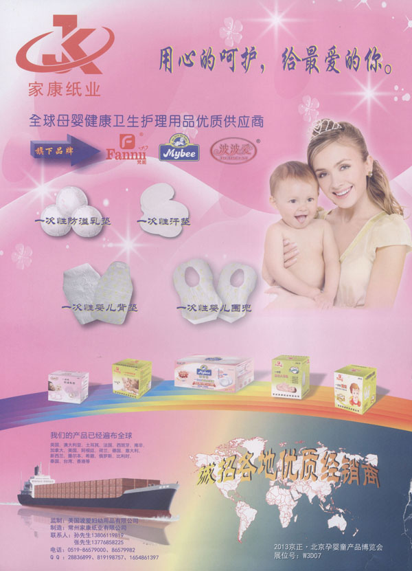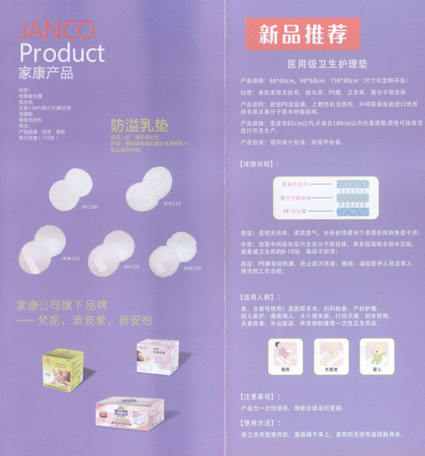 中國(JANCO)家康衛(wèi)生用品公司成立于2004年,我們專注于研發(fā)、設(shè)計、及制造健康的衛(wèi)生用品。我們的產(chǎn)品包括防溢乳墊、汗墊、寶寶背墊、圍兜、護(hù)理墊等。我們的生產(chǎn)廠房建設(shè)在中國江蘇省常州市,這是一個非常美麗的城市,并且我們的廠區(qū)鄰近沿江高速,交通非常便利。