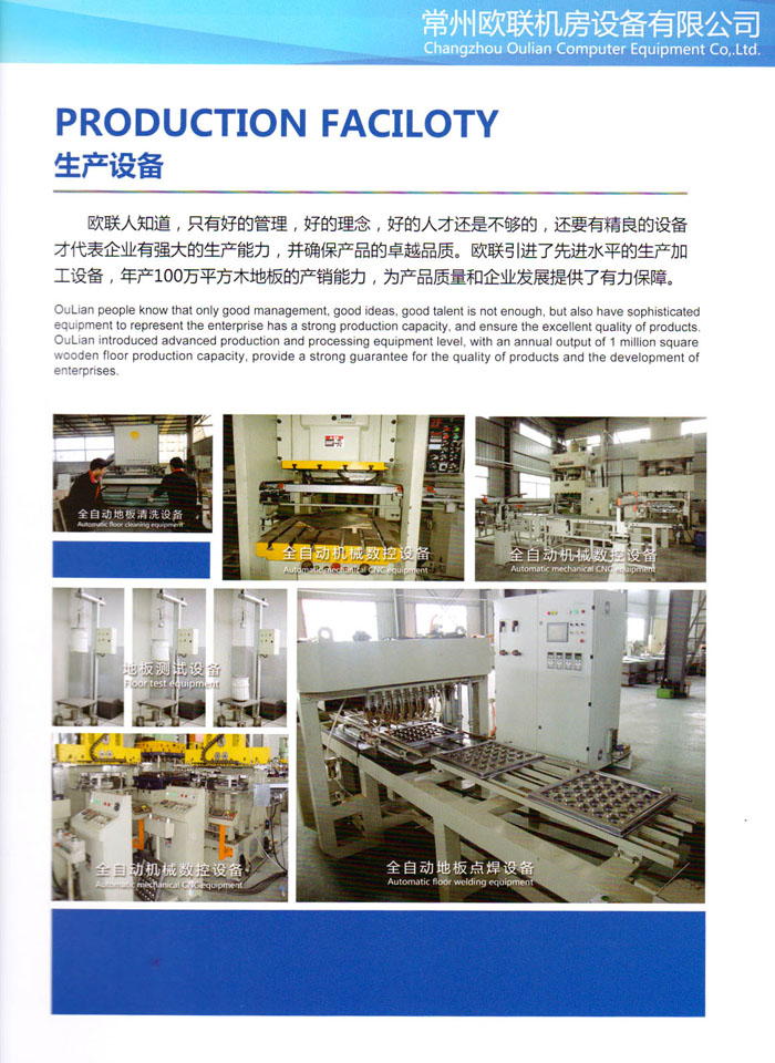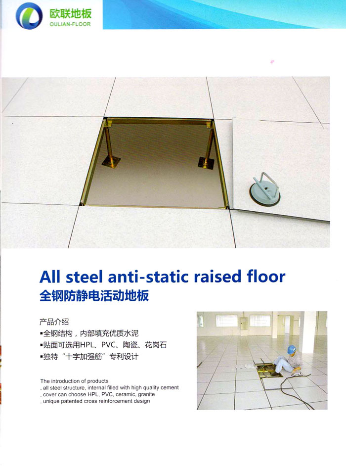 防靜電高架活動(dòng)地板、全鋼地板、陶瓷地板是計(jì)算機(jī)行業(yè)發(fā)展起來(lái)的新型鋪地材料,隔離了潮氣、靜電灰塵,最重要的是解決了綜合布線問(wèn)題,無(wú)需預(yù)埋管線,可隨時(shí)拆卸、搬移,保證了資訊設(shè)備完整的優(yōu)點(diǎn),適應(yīng)了智能化樓宇中信息自動(dòng)化技術(shù)對(duì)所處環(huán)境的特定要求,避免了廣大客戶(hù)的雙重投資,使現(xiàn)代化辦公程度更加高效,辦公場(chǎng)所更加舒適。 “歐聯(lián)”系列全鋼地板,符合國(guó)家安全要求,種類(lèi)完備多樣,其中防靜電陶瓷地板、硫酸鈣地板等除具有普通瓷質(zhì)的裝飾和實(shí)用性外,其耐磨、防水、防火功能優(yōu)于其它同類(lèi)產(chǎn)品,防靜電系列地板,能切合不同客戶(hù)的要求,其靈活的配置,深受客戶(hù)歡迎,不同材質(zhì)的地板結(jié)構(gòu)使設(shè)計(jì)師的設(shè)計(jì)空間比傳統(tǒng)的更加廣闊自由和善變。 公司大力發(fā)展國(guó)內(nèi)外銷(xiāo)售業(yè)務(wù),多次中標(biāo)國(guó)內(nèi)重點(diǎn)工程 ,例:哈爾濱醫(yī)科大學(xué)、山東大學(xué)、上海普通機(jī)場(chǎng)等。 公司將一如既往開(kāi)發(fā)和制造一流的產(chǎn)品,愿與廣大有識(shí)之士合作發(fā)展,共創(chuàng)美好未來(lái)。