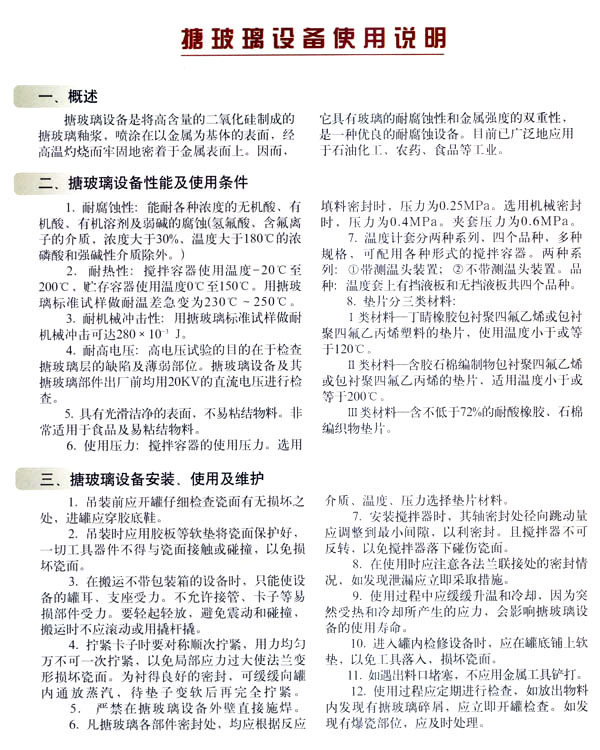 “利景”牌搪玻璃設(shè)備兼金屬材料的剛性和無(wú)機(jī)金屬材料的耐腐蝕性之雙重優(yōu)點(diǎn),搪玻璃層表面光滑、清洗方便,能隔離金屬離子,不污染也不粘物料,在化工、石油、農(nóng)藥、染料、塑料、食品等行業(yè)得到廣泛應(yīng)用。