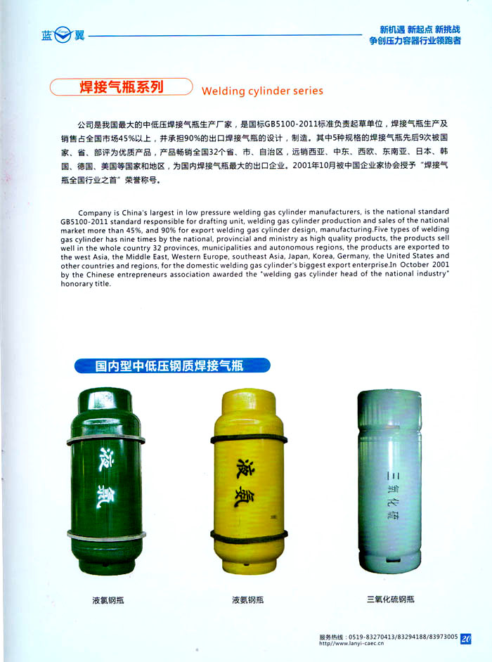 常州藍(lán)翼飛機(jī)裝備制造有限公司前身是常州飛機(jī)制造有限公司,是隸屬于中國(guó)航空工業(yè)第二集團(tuán)公司專(zhuān)業(yè)生產(chǎn)直升機(jī)、地效飛行器的企業(yè),2007年完成整體改制,現(xiàn)已發(fā)展成以壓力容器設(shè)計(jì)和制造為主營(yíng)業(yè)務(wù)的企業(yè)。公司占地70000平方米,生產(chǎn)廠房50000平方米,并擁有自行出口權(quán),鋼質(zhì)焊接氣瓶獲國(guó)家銀質(zhì)獎(jiǎng), 銷(xiāo)量占全國(guó)的45%,是國(guó)內(nèi)較大、品種較齊的鋼質(zhì)焊接氣瓶生產(chǎn)和出口企業(yè),出口量創(chuàng)中國(guó)企業(yè)新記錄。目前公司產(chǎn)品銷(xiāo)往 全國(guó)和美國(guó)、德國(guó)、澳大利亞、日本、韓國(guó)、埃及、印度、東南亞、中東等國(guó)家和地區(qū)。