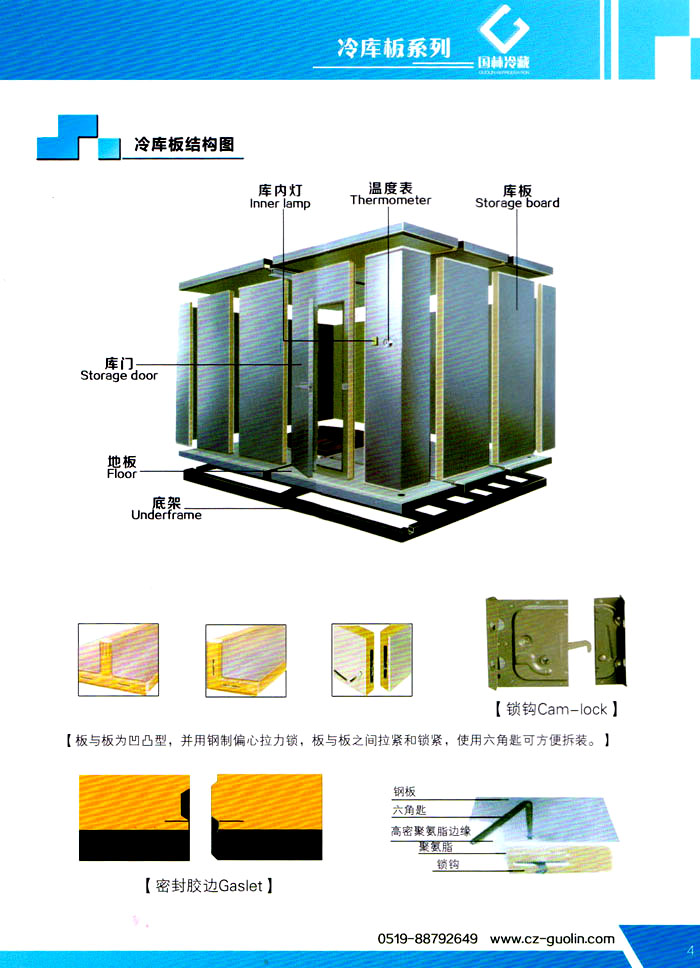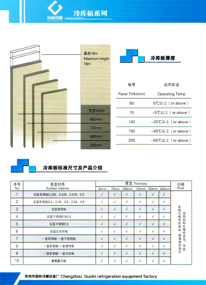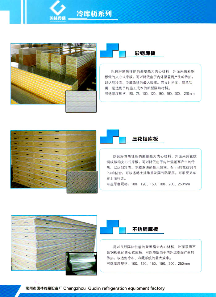 常州市國林冷藏設(shè)備廠(原武進(jìn)長虹冷藏設(shè)備廠)成立于1995年,地處江南水鄉(xiāng)中國富饒的“長江三角洲”中心區(qū)域—江蘇常州,滬寧高速、沿江高速、312國道,交通快捷,即刻到達(dá)。 國林冷庫:公司通過了ISO9001:2000質(zhì)量體系認(rèn)證,國林冷庫多次獲得“江蘇省優(yōu)質(zhì)產(chǎn)品”稱號,全國質(zhì)量服務(wù)AAAAA示范單位,并且是中國食品網(wǎng)、阿里巴巴,空調(diào)制冷誠信通會員企業(yè),并與全國多家設(shè)計(jì)院技術(shù)合作,本廠的誠信服務(wù)獲得了廣大客戶的認(rèn)可。 國林冷庫:中國制冷行業(yè)的十大冷庫制造商之一,中國制冷重要工業(yè)生產(chǎn)基地。本公司***生產(chǎn)保溫庫板及冷庫制冷成套設(shè)備,庫板材料涉及不銹鋼、彩鋼板、玻璃鋼板、保溫聚氨脂板。年產(chǎn)量3000多臺,庫板30多萬平方,歡迎新好客戶前來訂購。 國林制冷:公司始終堅(jiān)持:“質(zhì)量為上,追求品質(zhì)”的生產(chǎn)方針;始終信奉:“客戶為先,服務(wù)為本”的經(jīng)營理念。我們愿同廣大的新老客戶在新的世紀(jì)里,共同發(fā)展,利益雙贏,再創(chuàng)輝煌。 常州市國林冷藏設(shè)備廠***生產(chǎn)7.5公分,10公分,12公分,15公分,20公分的聚氨酯冷庫板,面板包括彩鋼板、不銹鋼板、壓花鋁板等各種板材,各種冷庫半埋門及平移動門,各種鐵排管和鋁排管,價格優(yōu)惠,有需要的可以聯(lián)系我金文燁18761183807