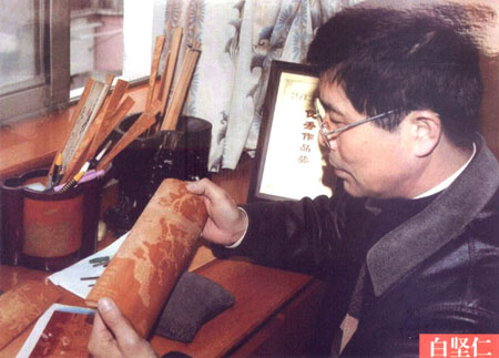 白堅(jiān)仁,1956年生于江蘇常州,國(guó)家級(jí)非物質(zhì)文化遺產(chǎn)、江蘇省級(jí)傳承人、江蘇省名人,高級(jí)工藝美術(shù)師,是留青竹刻泰斗白士風(fēng)之子。從小深受先父的熏陶和指點(diǎn),寒來署往、夜以繼日,不僅學(xué)到了先父厚樸豁達(dá)的品格,更深得先父竹刻藝術(shù)的真諦。除繼承刻有先父創(chuàng)立的橫臺(tái)屏、筆筒等作品外,更注重作品的創(chuàng)新。多年來,經(jīng)過艱辛的探索和反復(fù)的實(shí)踐,努力吸取姐妹藝術(shù),成功地采用了多片拼裝,配上紅木框架,制成大型的圖文并貌的作品,如帽籠、大插屏、鏡框掛件、四條屏、甚至中堂。在構(gòu)圖內(nèi)容、技法變化、裝幀形式等方面,都走出了創(chuàng)新之路,使所制作品適應(yīng)了現(xiàn)代人們的審美情趣和生活需求,實(shí)現(xiàn)了多年來要使留青竹刻與書畫作品同樣也能懸掛于廳堂之上的愿望。作品多次在國(guó)內(nèi)、國(guó)際展覽中獲獎(jiǎng),并獲得了留青竹刻史上的首位二項(xiàng)國(guó)家專利擁有者。