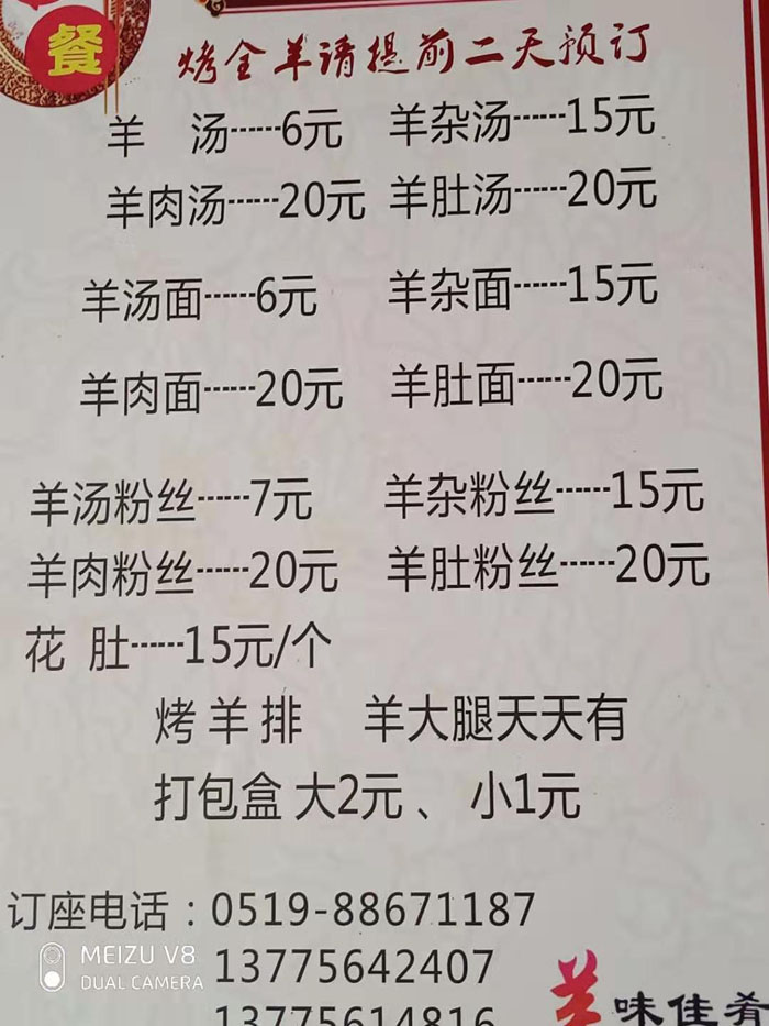 武進區(qū)鄭陸寧河全羊館從事羊肉經營四十年,羊館經營面積300平方米,從羊頭到羊蹄都能做菜:羊頭、羊排、羊拐、羊蹄、羊耳,其他還有羊羔,烤羊,羊湯面,清水羊肉,全羊宴。羊肉湯只是白煮,湯白而濃稠,肉爛味鮮,還不腥不油不膩。你若細看菜單就能發(fā)現(xiàn),全羊席幾乎都是拿燉湯帶出來的,這更加顯示出羊肉湯的魅力。 我們結合現(xiàn)代人飲食文化的特點,以考究的投料,精細的制作工藝,調出的全羊湯,湯汁乳白、鮮而不膳、香醇不膩、味道鮮美,具有補虛壯陽、溫中暖下之功效。