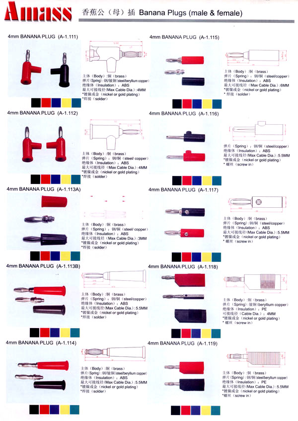 本公司專業(yè)生產(chǎn)各類香蕉插頭,香蕉插座,接線柱,電瓶夾,鱷魚夾,測試導(dǎo)線,測試筆等。產(chǎn)品分2mm/2.5mm/3mm/3.5mm/4mm五大系列,百余種款式, 各種香蕉插廣泛用于儀器、儀表、電力測試、教學(xué)、玩具,視聽設(shè)備、醫(yī)療儀器,保健產(chǎn)品等領(lǐng)域。公司技術(shù)力量雄厚,生產(chǎn)工藝先進,產(chǎn)品遠銷港、臺、歐美,并與飛利浦等國際品牌配套。公司本著精益求精的理念,歡迎新老客戶光臨。 我們擁有資深的工程師和豐富的電子產(chǎn)品銷售經(jīng)驗,專業(yè)生產(chǎn)各類電子接插件產(chǎn)品。 香蕉插頭,香蕉插座,電瓶夾,鱷魚夾等品種齊全、 質(zhì)量可靠,致力服務(wù)于通訊、數(shù)據(jù)通信、消費類電子產(chǎn)品、計算機和計算機外圍設(shè)備以及工業(yè)應(yīng)用等領(lǐng)域,能給客戶提供全面采購解決方案。 我們秉承穩(wěn)健作風(fēng)、誠實經(jīng)營、合理價格、完善服務(wù)的宗旨,在全體客戶的支持下,公司不斷創(chuàng)新進取,業(yè)績蒸蒸日上,已與數(shù)十家電子零件制造商及其分支機構(gòu)建立密切合作關(guān)系,在國內(nèi)擁有數(shù)百家固定客戶。