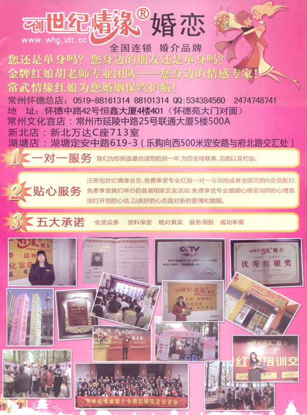 常州創(chuàng)世紀(jì)情緣婚介--是以實體婚介、活動操作、網(wǎng)絡(luò)婚介三大結(jié)合。也是常州最大的國家商務(wù)部特許全國連鎖品牌婚介,并自主創(chuàng)建品牌:常武情緣紅娘婚戀服務(wù)中心。目前是常州地區(qū)實力最大,口碑最好的婚介品牌連鎖機構(gòu).本公司曾榮獲江蘇優(yōu)質(zhì)誠信服務(wù)單位,常州市婚姻協(xié)會婚介理事單位,也是優(yōu)秀會員單位,也是武進區(qū)便民服務(wù)單位,榮獲優(yōu)秀紅娘獎 金牌紅娘獎,優(yōu)秀門店獎等榮譽 !冻V萃韴蟆 《揚子晚報》,央視,百度,化龍巷等長期合作單位。在工作中我們本著誠實守信、為會員保密的準(zhǔn)則。 金牌紅娘胡老師專業(yè)團隊服務(wù)宗旨是:架鵲橋,促良緣,真誠守信,用心溝通 用心服務(wù);我們的工作態(tài)度是:熱情、周到、不卑不亢。 我們的目標(biāo):打造常州婚戀第一中高端品牌,為客戶提供最高效率、最高質(zhì)量的專業(yè)婚戀服務(wù)。我們的優(yōu)勢是:平臺大,會員多,機會多,成功率高。一對一的全程婚戀服務(wù),專業(yè)婚戀情感輔導(dǎo),量身定制征婚方案。電腦海選加人工配對相結(jié)合的先進手段專為忙碌的城市白領(lǐng)省時高效地成就姻緣。走進情緣讓幸福不再遙遠。常武情緣紅娘為您婚姻保駕護航.給您百里挑一的機會,給您幸福一生的情緣”.找對象就找金牌紅娘胡老師專業(yè)團隊!地址:常州懷德店:懷德中路42號恒鑫大廈4樓401,(懷德苑北門對面),電話:0519-88161314,金牌紅娘胡老師:18015073344(微信同步)