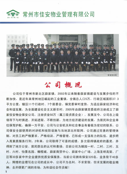 佳安物業(yè)管理有限公司位于常州市新北區(qū)薛家鎮(zhèn),2005年由薛家鎮(zhèn)黨委政府注冊成立,注冊資金50萬元,屬于三級資質企業(yè)。成立之初,佳安物業(yè)作為政屬事業(yè)單位,主要負責管理薛家鎮(zhèn)順園新村安置小區(qū)。隨著薛家鎮(zhèn)經濟和人口的發(fā)展,為主動適應經濟發(fā)展新常態(tài),全面深化物業(yè)綜合改革,打造具有薛家特色的物業(yè)公司,佳安物業(yè)由政府下屬的事業(yè)單位正式轉變?yōu)楠毩⑦\營的企業(yè),并增資到1000萬元。 2017年6月,公司通過審核被評為“AAA”級信用企業(yè),同月,公司實施ISO9001質量管理體系標準,并于8月通過質量體系認證審核。2018年8月,公司通過了ISO14001環(huán)境管理體系、ohsas18001職業(yè)健康安全管理體系的認證審核。 目前,公司主要承接小區(qū)物業(yè)服務及廠區(qū)外派保安服務、保潔服務等,F公司為薛家鎮(zhèn)順園一村至順園九村安置小區(qū)及奧林匹克花園、怡景名園2處商業(yè)小區(qū)提供物業(yè)服務;為江南農村商業(yè)銀行新北區(qū)所有支行、中車鐵馬、投資服務中心、華夏藝博園、薛家幼兒園、薛家小學及薛家中學等單位提供外派保安服務;為薛家鎮(zhèn)中心廣場及松林別墅提供保安服務;為華夏藝博園及投資服務中心提供保潔服務等。 在這十余年中,佳安物業(yè)與時俱進,銳意進取,為地方建設發(fā)展注入動力,為居民和企業(yè)安全保駕護航,尤其是在實踐中,我們積極探索,正逐步摸索出一條適合薛家城鄉(xiāng)一體化建設的社區(qū)物業(yè)管理的新路。希望通過今天的分享,和大家一起探討我們在“管辦分離”等方面的實踐經驗,并在此基礎上為薛家的可持續(xù)發(fā)展提供可借鑒、推廣的新型物業(yè)管理之路。