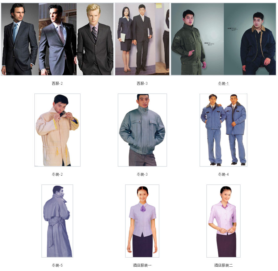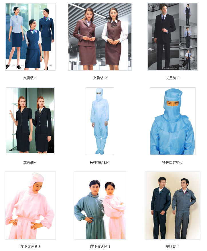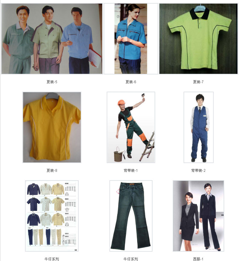 目前本公司專業(yè)生產(chǎn)的品種主要有:工作服裝、牛仔工作服、西服、酒店賓館(餐飲)服裝、校服、醫(yī)務(wù)、保安、美容、美發(fā)、按摩、超市團體服裝等。