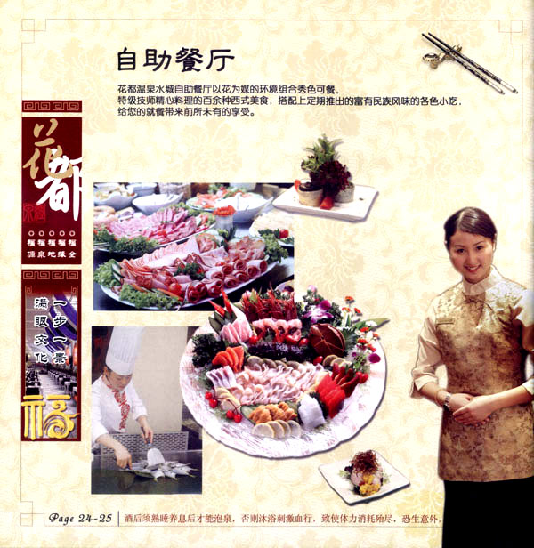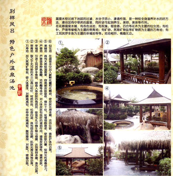 淹城花都溫泉水城孕育天地之精華,悅身、悅?cè)、悅心、悅神。置身其中泉水潺潺,霧氣繚繞、花瓣飄香,恍若仙境!稗渌略谑,弄花香滿衣”,花都溫泉的浪漫與溫潤在這里完美展現(xiàn)。 花都溫泉水城包括洗浴區(qū)、戲水世界、露天溫泉、自助餐廳、生態(tài)房、別墅區(qū)、紅文化房、VIP區(qū)等多種功能區(qū)域,是集溫泉養(yǎng)生、休閑住宿、演藝會務(wù)為—體的休閑度假勝地,給賓客帶來江南小鎮(zhèn)的浪漫水城之旅。 古木新枝畔賓客對酒當(dāng)歌,溪泉石椅旁把茶品啜。 淹城-三勤生態(tài)酒店,這里是一處綠色生態(tài)的美食家園。此地鬼斧神工.奇水異石,和風(fēng)細(xì)雨林中穿過,引百鳥朝來暮歌;這里集生態(tài)餐飲、演藝、中小型會務(wù)為一體,將現(xiàn)代裝飾風(fēng)格和古雅拙樸的自然裝修完美整合;這里聚集大江南北名廚,推出精致綠色美昧佳肴。來到這里,賓客可享田園至美之景,品舌尖至鮮之味,實(shí)乃人生一大樂事。