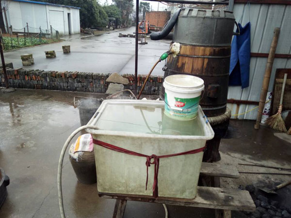 第二步:冷卻降溫,糯米蒸熟后,用冷水淋沐,直至糯米飯溫度降到35℃左右。要知道這個(gè)溫度非常關(guān)鍵,太冷了會(huì)影響之后酒曲發(fā)酵,溫度太高會(huì)把酒曲中的酵母殺死。不靠溫度計(jì),老徐靠得完全是自己多年的經(jīng)驗(yàn)。