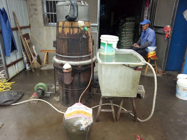 第四步:放入缸中,酒曲和糯米拌好后,便可放入屋內(nèi)的大缸中,并在其中挖出個(gè)圓形的洞,放入竹筒做酒窩。在此之前,大缸可用之前冷卻糯米飯的溫水擦一擦暖缸,這樣更有益于酒曲發(fā)酵。為了保證酒曲發(fā)酵的溫度,還要給酒料附上塑料薄膜。若是氣溫低于零度,還得多蓋上幾層棉被才行。像池阿姨家的400斤糯米,老徐至少要重復(fù)這些步驟八遍!大缸中的酒料大約發(fā)酵了10天左右,在酒乳已非常豐富之際,按照1:1的比例,打開封口加入冷開水,然后再蓋上棉被。繼續(xù)放置45天后,米酒才算大功告成!如果覺得米酒不過癮,老徐還會(huì)將米酒吊成燒酒,也就是白酒,依舊是傳統(tǒng)的老手藝。未來某天,TA會(huì)消失 ,其實(shí),做米酒的方法并不難,幾乎是以前家家戶戶的必備技能。然而現(xiàn)如今,不僅老常州們不再自己做酒,就連像老徐這樣的做米酒手藝人也越來越少。就連跟了老徐三十多年的一套米酒家當(dāng),也同樣經(jīng)不起歲月:鐵鍋漏了要去找橫山橋的老師傅;木桶壞了要去禮嘉修;爐子也有專門的式樣,過幾年就要拿著圖紙找人翻新......