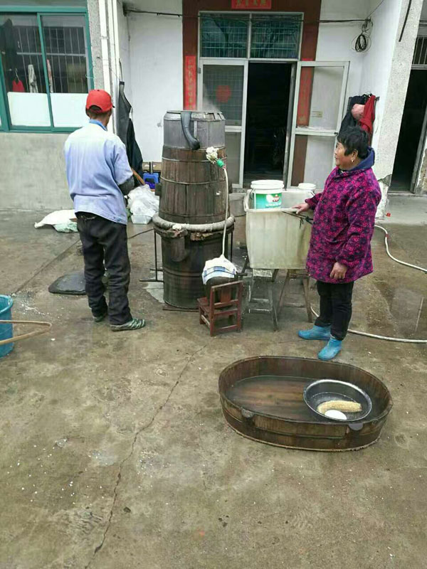 家住遙觀,今年69歲的老徐做釀酒這一行已有30余年。之前跟著位老師傅學(xué)手藝,而如今,自己已然成為了「手作米酒」界的老師傅。從11月中旬開始,老徐每天早上七點(diǎn)鐘準(zhǔn)時(shí)出發(fā),帶著自己所有的米酒家當(dāng):大木桶、煤球爐、長板凳、竹蠶匾...還有自家老伴兒,騎著電動(dòng)三輪車前往雕莊、馬杭、遙觀、坂上一帶上門做米酒。加上釀酒后的吊燒酒,一直要做到來年七月份,幾乎沒有休息。光是這個(gè)冬天,老徐已經(jīng)做了五萬到六萬斤糯米。說起做米酒的門道,老徐對這“泡、蒸、晾、拌、壓”等十幾道工序如數(shù)家珍:一般說來,100斤糯米能釀150斤米酒,最終能吊出65斤左右的燒酒。家住雕莊的池阿姨是老徐的老主顧,前前后后在老徐這做了二十多年。池阿姨今年準(zhǔn)備了400斤糯米,想著都做成米酒,送送親戚和朋友。為此,池阿姨提前一周與老徐約定好上門做酒的時(shí)間,并且從米店買回了糯米。根據(jù)老徐的提示,池阿姨隔天將糯米淘凈后,再在缸中放滿水浸入糯米至少8小時(shí)。在老徐到來之前,池阿姨將糯米撈起瀝干,直到用手抓捏不黏為止。第二天一大早,當(dāng)老徐在池阿姨家門口的空地上擺放好所有米酒家當(dāng),做米酒才算真正來開了序幕!