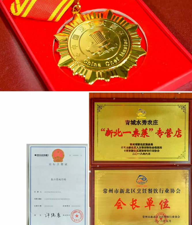 2018年“青城仔鵝”入選新北區(qū)評(píng)選出的“十大特色名菜”之首,法人朱全林還獲得“中國(guó)烹飪大師”稱號(hào)。幾年中,還參加由區(qū)、鎮(zhèn)舉辦的各項(xiàng)美食文化活動(dòng):春江江鮮莢食文化節(jié),新北區(qū)江鮮美食文化旅游節(jié)暨“中洋杯”河豚技能大賽等。