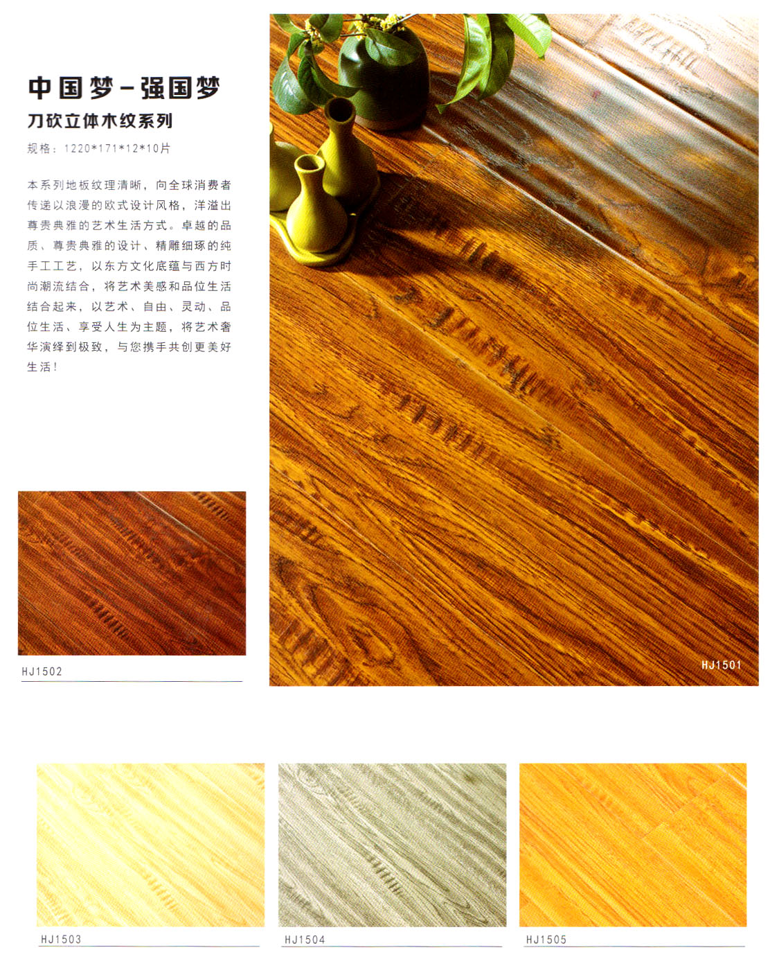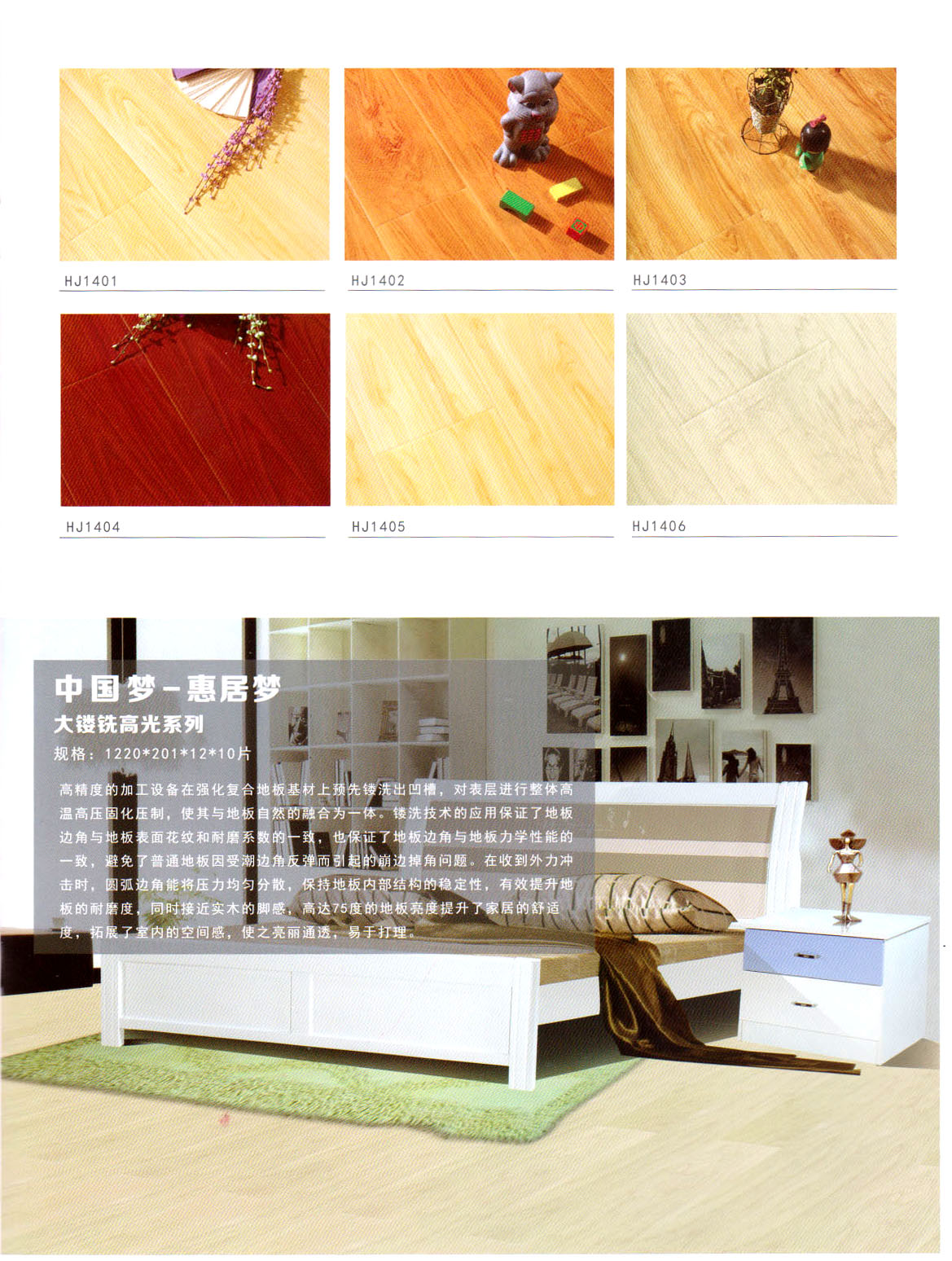 目前我們主要經(jīng)營“惠居”、  “靈盛”牌木質(zhì)強(qiáng)化地板,現(xiàn)在已經(jīng)開發(fā)出水晶面、羽絲面、浮雕面、立體刀砍紋、手抓紋、4v仿實木、金剛淋漆面、模壓面、橡木真木紋、防水系列等多個系列產(chǎn)品,涵蓋了市場上所出現(xiàn)的所有產(chǎn)品系列!