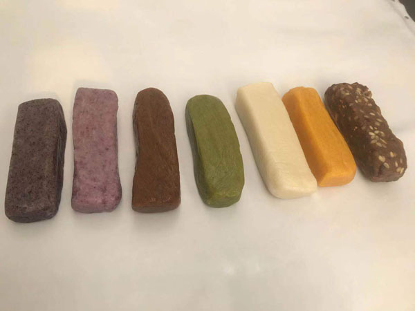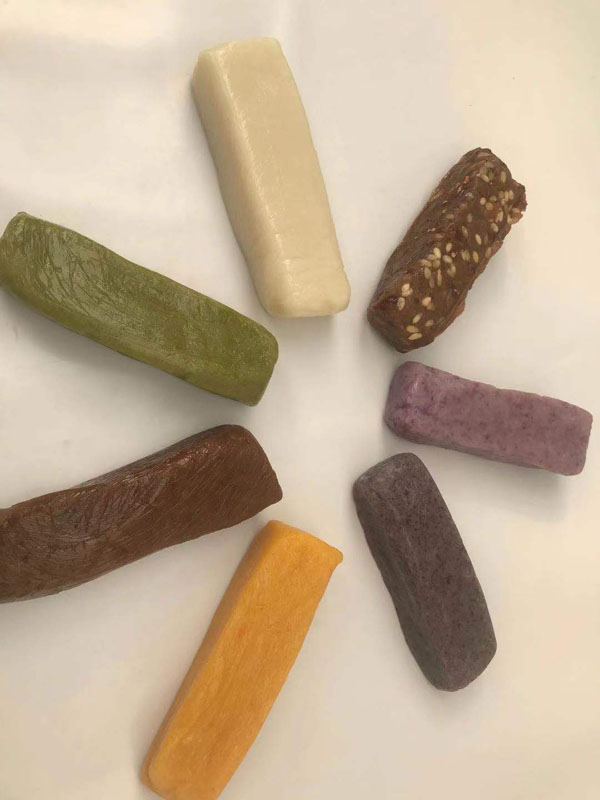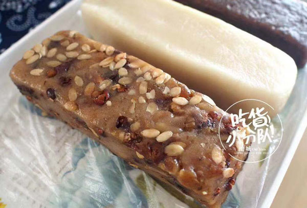 腳踏糕本名“年糕”,按常州周邊地區(qū)的風(fēng)俗習(xí)慣,在春季前夕,各家各戶都要蒸年糕,吃年糕!案狻敝C音“高”,過年吃年糕被賜予“年年高”,一年高一年,鋒吉祥之意,表達(dá)這人們對(duì)未來美好生活的憧憬和良好的祝愿。今天小編要帶大家的就是一家至今保持著傳統(tǒng)手工制作的鈺鋒糕點(diǎn)坊。   鈺鋒糕點(diǎn)坊位于常州鄭陸鎮(zhèn)三皇廟范家莊,一個(gè)比較偏僻的村莊,雖然這家作坊不大,但香糯絲滑,軟糯適中,韌勁十足的腳踏糕吸引了無數(shù)的食客。制作一條腳踏糕要從淘米,浸泡,碾粉,鋪粉,一層一層的鋪下去,需要無數(shù)道制作工序,這些都是店主孫煥公公老周,憑著幾十年的經(jīng)驗(yàn),加上店主孫煥從不馬虎的決心!   這“腳踏”也并非赤腳上陣,而是把蒸好的糕倒入早以準(zhǔn)備好的框子里,用布包裹好,上面再用薄膜包好,再蓋上布,再換上專門腳踏的布鞋,踩的時(shí)候要?jiǎng)蚍Q,左右腳要配合好,不然糕會(huì)高高低低,不平整,最后再拿蠟燭線拆成一條小長條,再拿帶包裝好,如此又香又糯的腳踏糕就大功告成了。   店主孫煥為了讓更多的人認(rèn)識(shí)和了解常州腳踏糕的傳統(tǒng)文化和美食,她在傳統(tǒng)工藝中增加了適合現(xiàn)代文化的多種口味,她在糕里加入南瓜,紫薯,老紅糖,大麥汁,血糯米,核桃,葡萄干,紅棗等食材,做出五顏六色,純天然的口味,深受食客們的喜愛,不管是送人還是自己吃都非常新穎。