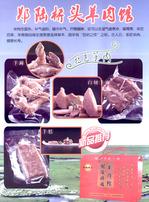 鄭陸橋頭羊肉館主要從事羊肉、羊肉制品的加工。羊肉性溫?zé)帷⒀a氣滋陽、暖中補氣、開胃健脾、還可以去濕氣避寒冷,暖胃寒、養(yǎng)吃百草、養(yǎng)根據(jù)自身生理需要選擇草木、固羊有“百藥之庫”之稱。古人云:多吃羊肉、健康長壽。