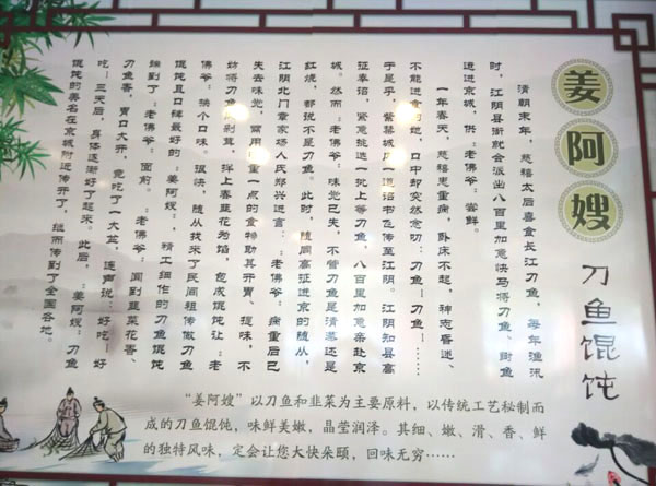 武進(jìn)高新區(qū)姜阿嫂刀魚餛飩店經(jīng)營面積480平方米,可容納150人左右用餐,主要特色刀魚餛飩,蟹黃大湯包,榮獲“江蘇省鄉(xiāng)村美食節(jié)”金獎和銀獎。另外還有特色刀魚面,刀魚春卷及蟹肉餛飩,蝦肉餛飩。 本店在經(jīng)營過程中堅(jiān)持以品質(zhì)為主,貨真價(jià)廉,貨品貴面價(jià)不貴,原料“刀魚”全是現(xiàn)場開片去骨。開業(yè)至今,深受廣大消費(fèi)者的好評,是常州地區(qū)唯一以刀魚為特色的餐飲店。