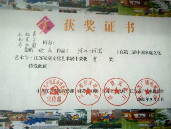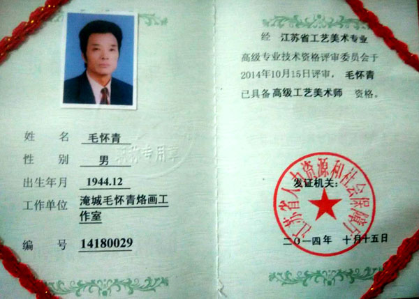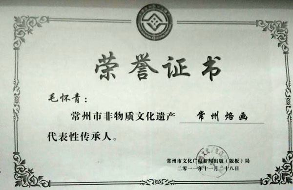 毛懷青,江蘇常州市武進(jìn)人。 中國工藝美術(shù)學(xué)會會員,常州市中國烙畫研究會副會長,常州市文博鑒賞協(xié)會理事,非物質(zhì)文化遺產(chǎn)烙畫傳承人。高級工藝美術(shù)師。 年輕時學(xué)習(xí)國畫、油畫中年蔓現(xiàn)掌州咯畫源遠(yuǎn)流長、歷史悠久,有著其它美術(shù)門類不具備的藝術(shù)風(fēng)格與特色?芍^是工藝美術(shù)中的一朵十分亮麗的藝術(shù)奇葩,是我民族先人給我們留下的一份不可多得十分珍貴的一份文化遺產(chǎn)。為弘揚(yáng)與發(fā)展這份優(yōu)秀文化遺產(chǎn),我從此下定決心研究烙畫,愿付出一份力量為振興烙畫事業(yè)做出貢獻(xiàn)。至今已潛心研究幾十年,取得了可喜的成績,被業(yè)界公認(rèn),社會關(guān)注與認(rèn)可。有“江南烙畫第一筆”之美譽(yù)。 近年來,創(chuàng)作的烙畫作品分別獲得過全國、省市級的金、銀、銅獎多次。中央電視臺曾兩次播放過本人的烙畫作品,江蘇電視臺、常州電視臺也曾多次播放過本人的作品與烙畫藝術(shù)生涯,揚(yáng)子晚報、常州日報、常州晚報也曾多次報導(dǎo)過本人的烙畫作品,出版物有三種版本都能查閱到介紹本的烙畫從藝生涯與藝術(shù)業(yè)績。