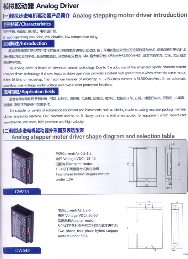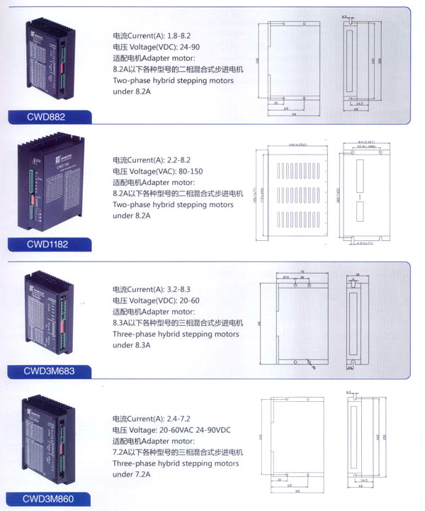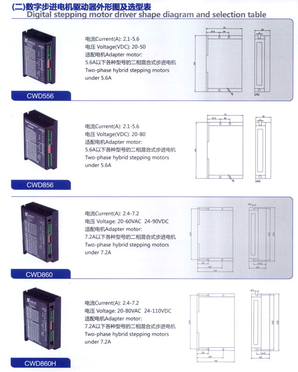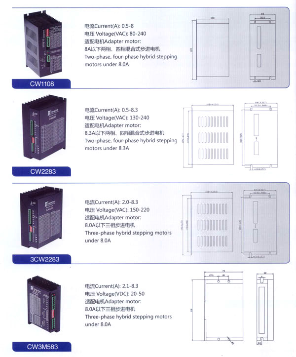 我公司的主要產(chǎn)品有20BH系列、28BH系列、35BH系列、39BH系列、42BH系列、42BHH系列、57BH圓形系列、57BHH方形系列、60BHH方形系列、86BH圓形系列、86BHH方形系列,以及110BHH系列的四相(二相)混合式步進(jìn)電。CW60BL、CW63BL、CW70BL、CW92BL系列無(wú)刷電機(jī)也相繼上市。另外步進(jìn)電機(jī)驅(qū)動(dòng)器CW215、CW230、CW5045、CW8060、CW6060AC、CW1108以及全新數(shù)字式驅(qū)動(dòng)器CWD230、CWD556、CWD860H、CW2M2208、CW3M2208和閉環(huán)電機(jī)驅(qū)動(dòng)器CWDS556,CWDS660,CWDS860H,CWDS880L,CWDS1108,CWDS2206等系列也暢銷全球。另外本公司也可對(duì)外承接各種步進(jìn)電機(jī)及相關(guān)工控系統(tǒng)的應(yīng)用系統(tǒng)工程。