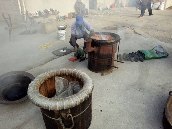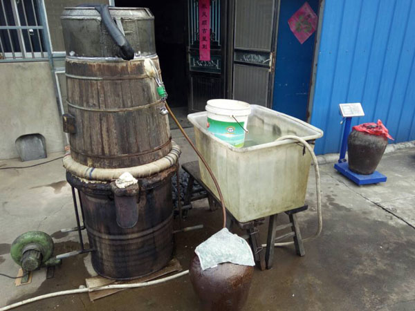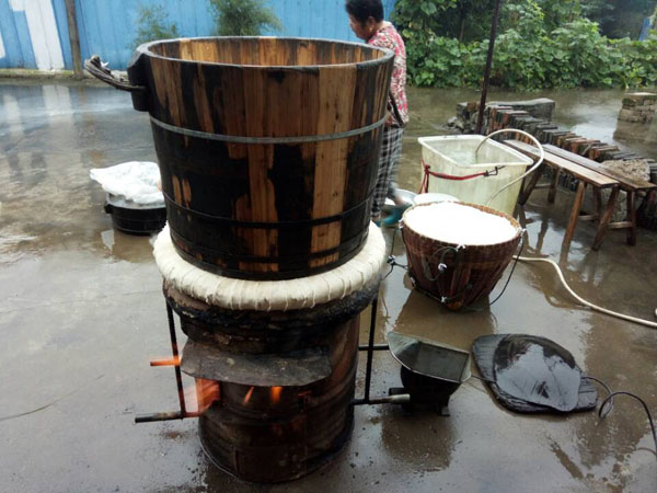 第四步:放入缸中,酒曲和糯米拌好后,便可放入屋內的大缸中,并在其中挖出個圓形的洞,放入竹筒做酒窩。在此之前,大缸可用之前冷卻糯米飯的溫水擦一擦暖缸,這樣更有益于酒曲發(fā)酵。為了保證酒曲發(fā)酵的溫度,還要給酒料附上塑料薄膜。若是氣溫低于零度,還得多蓋上幾層棉被才行。像池阿姨家的400斤糯米,老徐至少要重復這些步驟八遍!大缸中的酒料大約發(fā)酵了10天左右,在酒乳已非常豐富之際,按照1:1的比例,打開封口加入冷開水,然后再蓋上棉被。繼續(xù)放置45天后,米酒才算大功告成!如果覺得米酒不過癮,老徐還會將米酒吊成燒酒,也就是白酒,依舊是傳統(tǒng)的老手藝。未來某天,TA會消失 ,其實,做米酒的方法并不難,幾乎是以前家家戶戶的必備技能。然而現(xiàn)如今,不僅老常州們不再自己做酒,就連像老徐這樣的做米酒手藝人也越來越少。就連跟了老徐三十多年的一套米酒家當,也同樣經(jīng)不起歲月:鐵鍋漏了要去找橫山橋的老師傅;木桶壞了要去禮嘉修;爐子也有專門的式樣,過幾年就要拿著圖紙找人翻新......