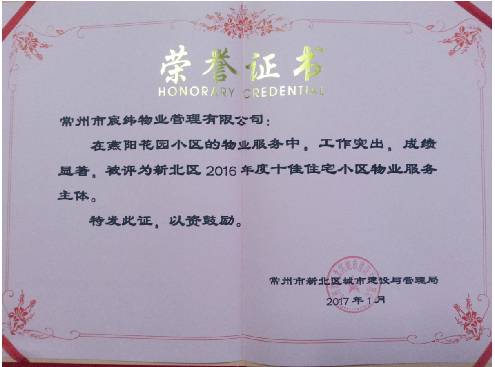 常州市宸緯物業(yè)管理有限公司成立于 2005 年,獲得國(guó)家二級(jí)資質(zhì),是常州市物業(yè)管理協(xié)會(huì)理事單位,并通過(guò)ISO9001:2008 質(zhì)量管理體系、ISO14001:2004 環(huán)境管理體系、OHSAS18001:2007 職業(yè)健康安全管理體系,三標(biāo)一體認(rèn)證,獲得AAA級(jí)企業(yè)資質(zhì)信用等級(jí)、AAA級(jí)重合同守信用企業(yè)、AAA級(jí)質(zhì)量服務(wù)信譽(yù)企業(yè)、AAA級(jí)誠(chéng)信經(jīng)營(yíng)示范單位。