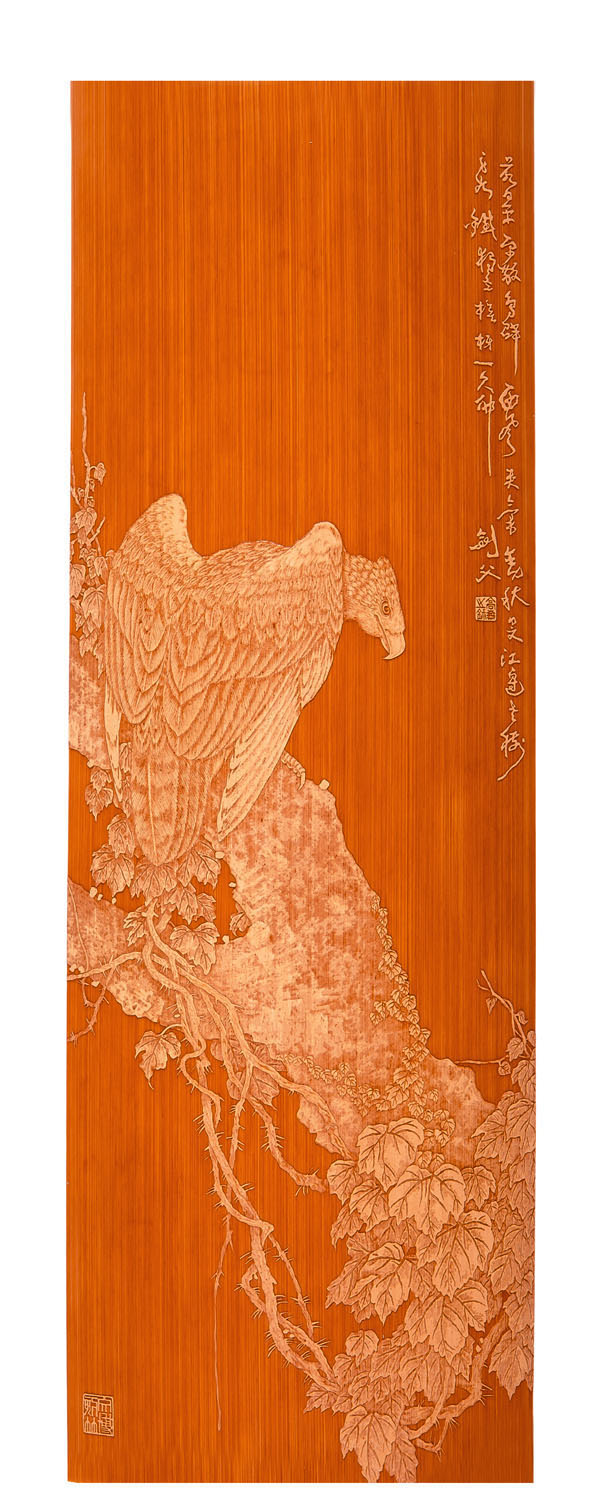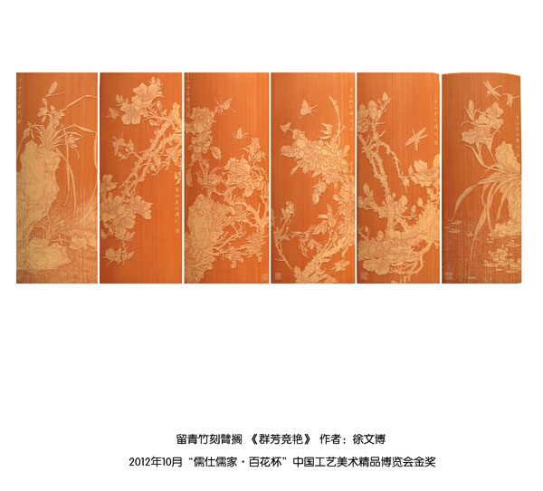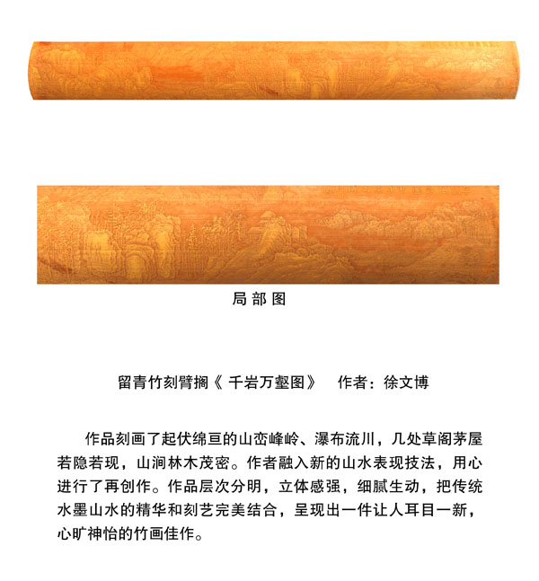 徐博(藝名文博),1973年生,江蘇武進人,江蘇省省名人,高級工藝美術(shù)師,常州市留青竹刻非遺傳承人,常州工藝美術(shù)家協(xié)會理事,被譽為當今中國最具創(chuàng)新意識的新銳竹刻家代表,多次獲得國家工藝美術(shù)大獎。酷愛留青竹刻的徐文博賞竹為樂,以竹詠志,借竹抒懷,悉心探索留青竹刻的藝術(shù)表現(xiàn)。在中國工藝美術(shù)大師蕭劍波的精心指導下,開創(chuàng)留青水墨山水之技法,更好的體現(xiàn)了竹刻淡雅清秀的藝術(shù)風格,并不斷汲取書畫、攝影、雕塑等藝術(shù)精華,不斷滋養(yǎng)藝術(shù)情趣,提升擴展胸襟人格的同時也逐步形成了其形神兼?zhèn),虛實相生,氣韻生動的藝術(shù)特點,作品為眾多的國內(nèi)外收藏家珍藏。