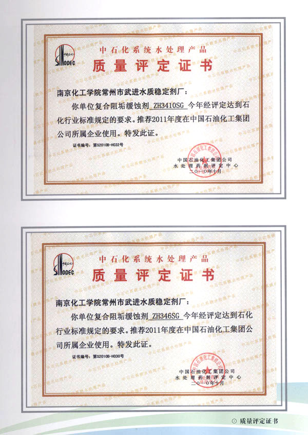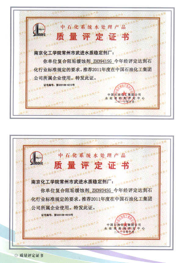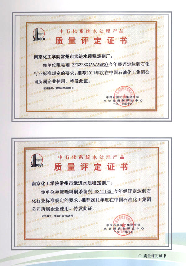 企業(yè)運(yùn)用嚴(yán)密的科學(xué)管理,配有先進(jìn)的工藝技術(shù)和精良的生產(chǎn)裝備,保持高標(biāo)準(zhǔn)的產(chǎn)品質(zhì)量。所生產(chǎn)的水質(zhì)穩(wěn)定劑達(dá)到或超過國際先進(jìn)水平,擁有PBTCA等多個(gè)江蘇省高新技術(shù)產(chǎn)品,DPSC緩蝕阻垢劑被列為國家星火計(jì)劃項(xiàng)目,工業(yè)循環(huán)水用新型緩蝕阻垢殺菌劑被國務(wù)院評(píng)為國家科技進(jìn)步二等獎(jiǎng)。主要產(chǎn)品均通過部、省級(jí)科技成果鑒定,連續(xù)十多年被中國石化總公司評(píng)定為合格推薦產(chǎn)品。企業(yè)已通過IS09001、IS014001國際質(zhì)量、環(huán)境認(rèn)證,為國內(nèi)外石化行業(yè)、冶金、鋼鐵、化肥、電力、紡織等領(lǐng)域的工業(yè)循環(huán)冷卻水的水質(zhì)處理提供了必不可少的配套產(chǎn)品。