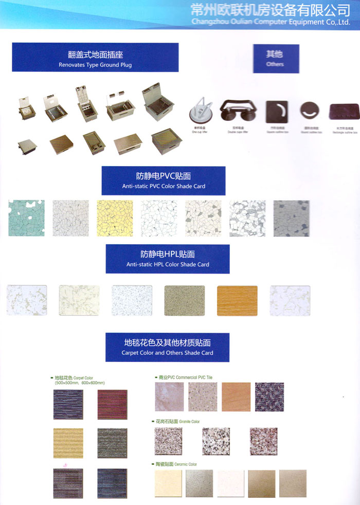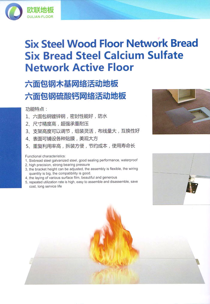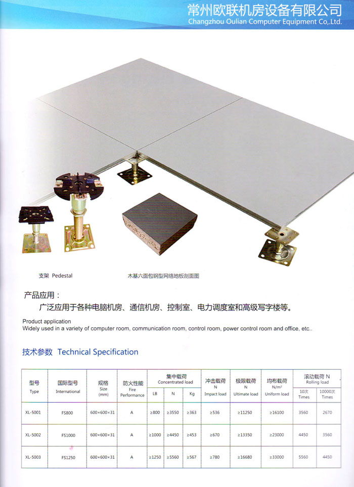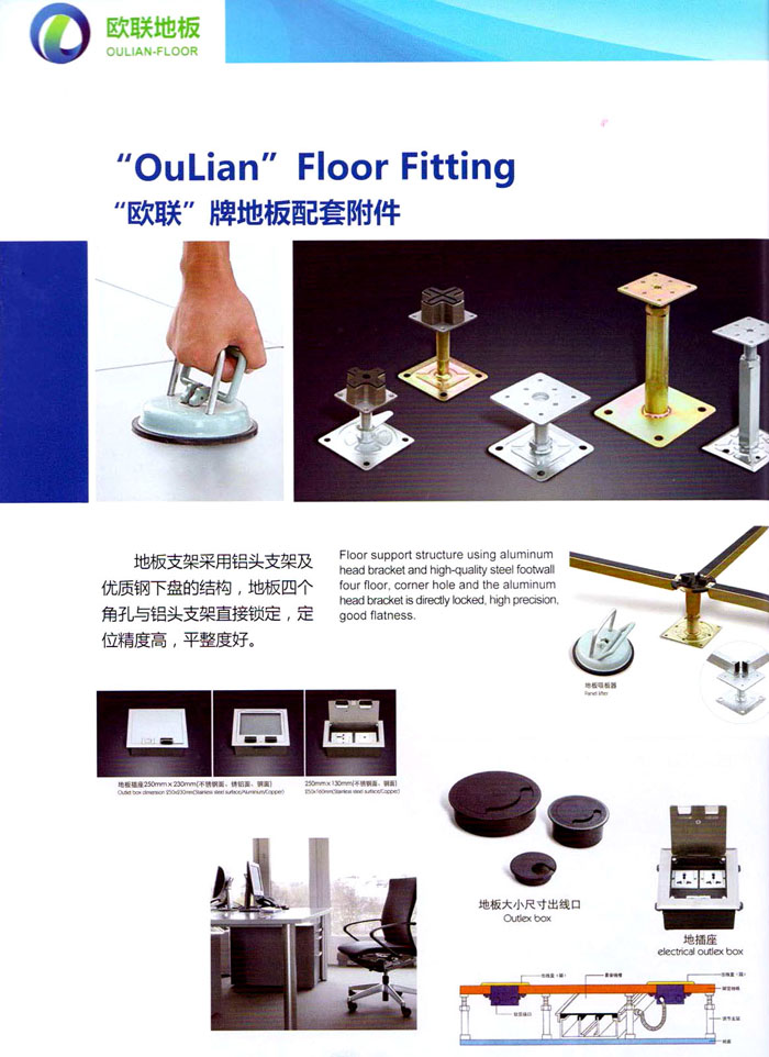 防靜電高架活動(dòng)地板、全鋼地板、陶瓷地板是計(jì)算機(jī)行業(yè)發(fā)展起來(lái)的新型鋪地材料,隔離了潮氣、靜電灰塵,最重要的是解決了綜合布線問(wèn)題,無(wú)需預(yù)埋管線,可隨時(shí)拆卸、搬移,保證了資訊設(shè)備完整的優(yōu)點(diǎn),適應(yīng)了智能化樓宇中信息自動(dòng)化技術(shù)對(duì)所處環(huán)境的特定要求,避免了廣大客戶的雙重投資,使現(xiàn)代化辦公程度更加高效,辦公場(chǎng)所更加舒適。 “歐聯(lián)”系列全鋼地板,符合國(guó)家安全要求,種類完備多樣,其中防靜電陶瓷地板、硫酸鈣地板等除具有普通瓷質(zhì)的裝飾和實(shí)用性外,其耐磨、防水、防火功能優(yōu)于其它同類產(chǎn)品,防靜電系列地板,能切合不同客戶的要求,其靈活的配置,深受客戶歡迎,不同材質(zhì)的地板結(jié)構(gòu)使設(shè)計(jì)師的設(shè)計(jì)空間比傳統(tǒng)的更加廣闊自由和善變。 公司大力發(fā)展國(guó)內(nèi)外銷售業(yè)務(wù),多次中標(biāo)國(guó)內(nèi)重點(diǎn)工程 ,例:哈爾濱醫(yī)科大學(xué)、山東大學(xué)、上海普通機(jī)場(chǎng)等。 公司將一如既往開(kāi)發(fā)和制造一流的產(chǎn)品,愿與廣大有識(shí)之士合作發(fā)展,共創(chuàng)美好未來(lái)。